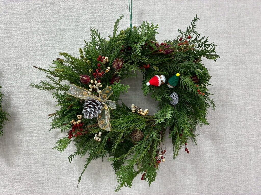 リースの材料は毎年職員が集めています。ボリューム満点のリースの中のサンタさんも職員の手作りです!