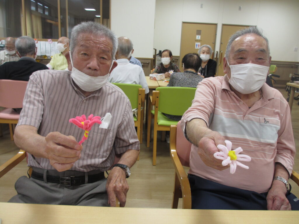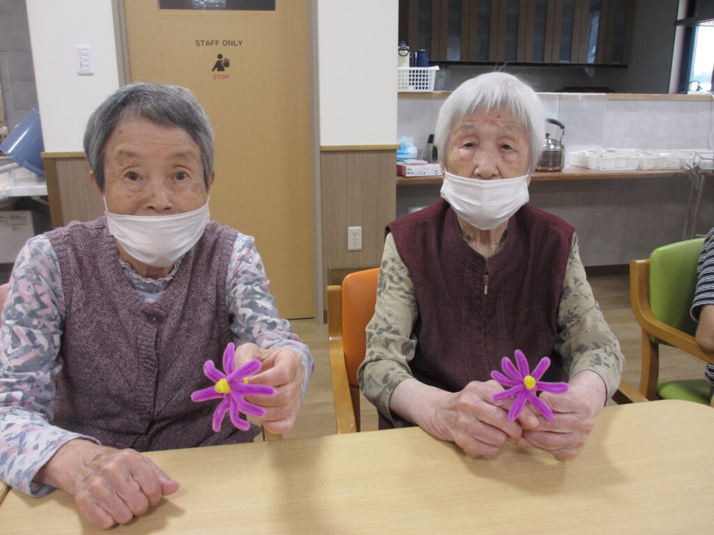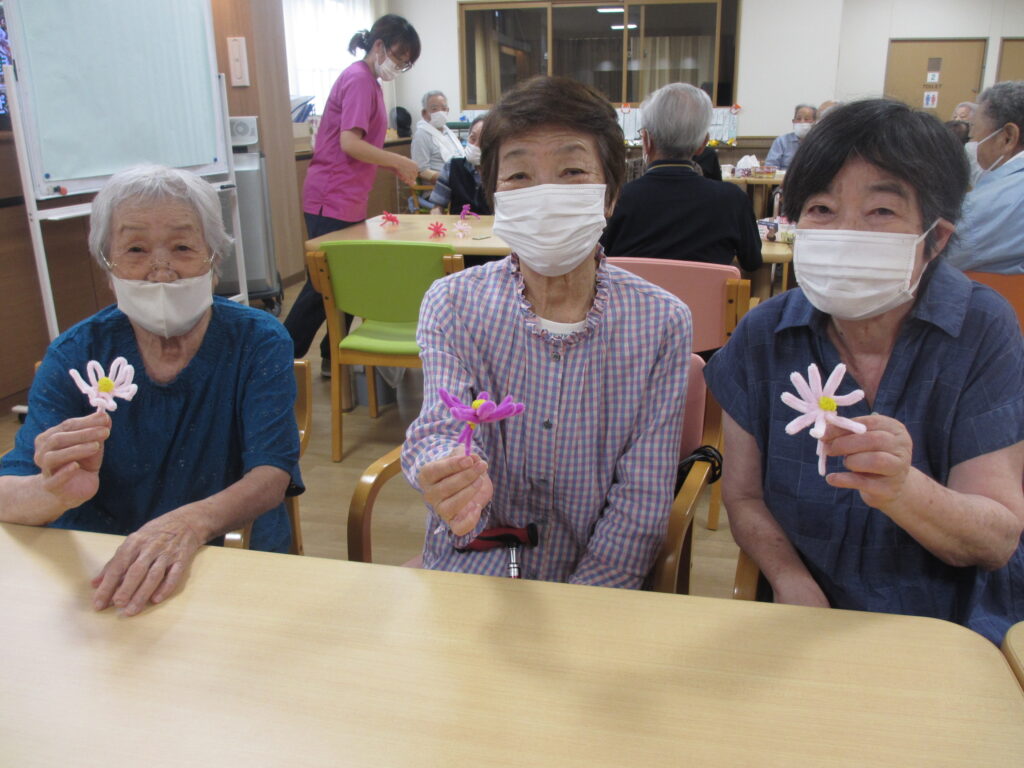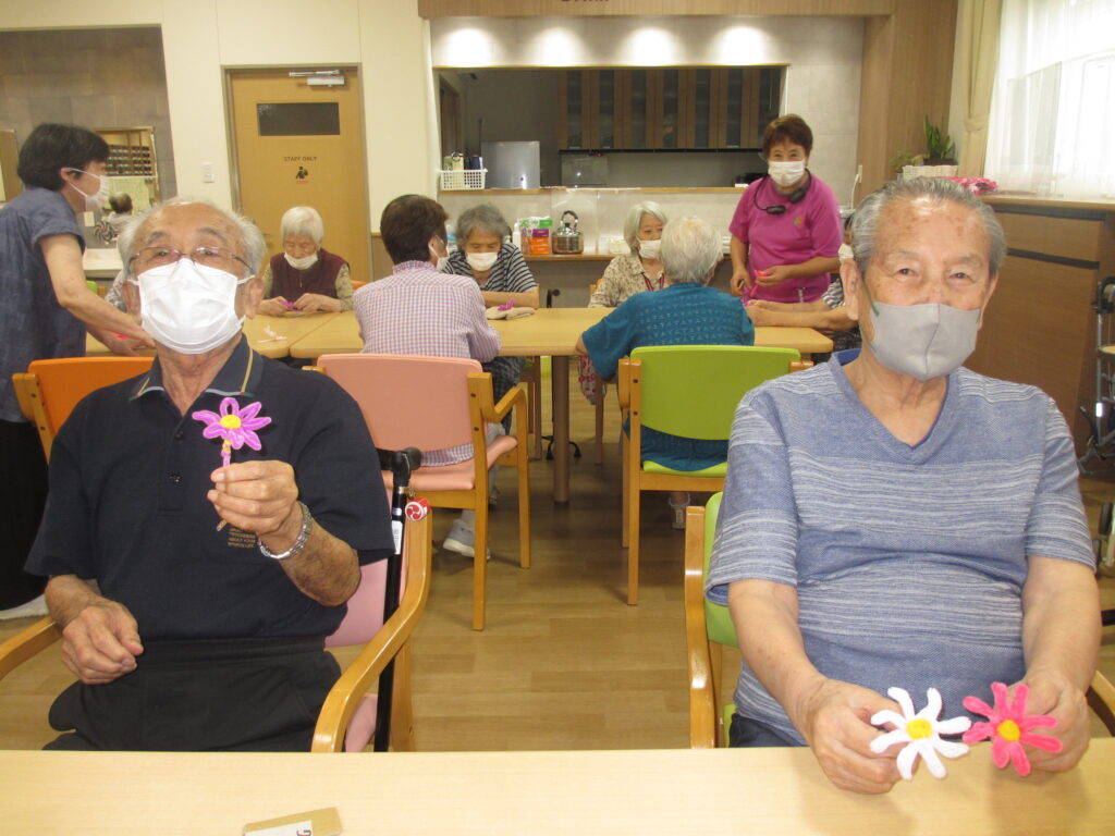 利用者様とモールを段ボールに巻き付けてコスモスの花とトンボを制作しました(^^♪『1回、2回・・・8回巻いて!』と数えながら巻き付けていただきました。これから花ができるなんて想像もできませんでしたが、開いて可愛い花が出来ると「凄い!綺麗にできた!」と見せていただきました。トンボも張り秋らしい素敵な壁紙が完成しました(#^.^#)