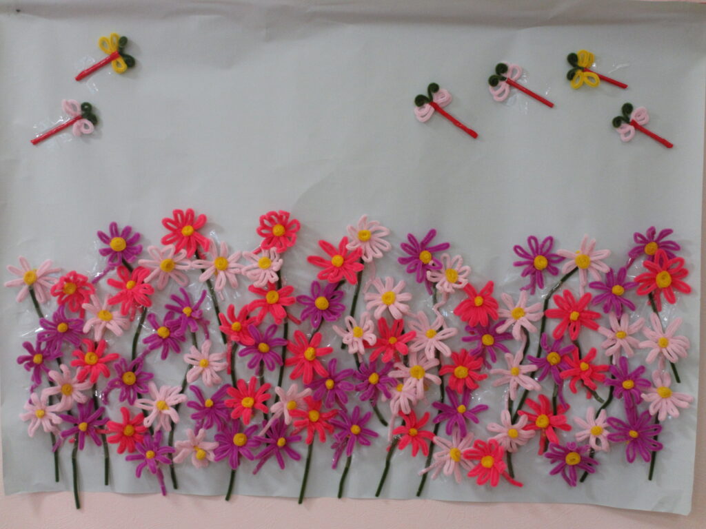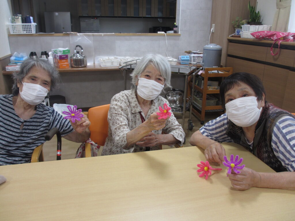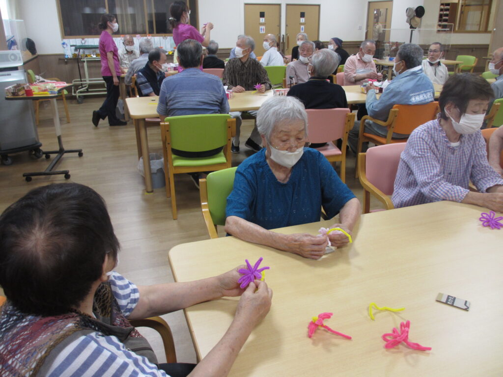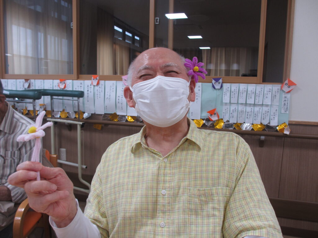 利用者様とモールを段ボールに巻き付けてコスモスの花とトンボを制作しました(^^♪『1回、2回・・・8回巻いて!』と数えながら巻き付けていただきました。これから花ができるなんて想像もできませんでしたが、開いて可愛い花が出来ると「凄い!綺麗にできた!」と見せていただきました。トンボも張り秋らしい素敵な壁紙が完成しました(#^.^#)