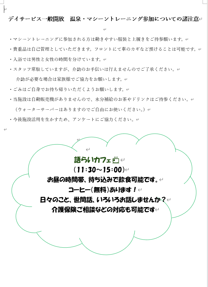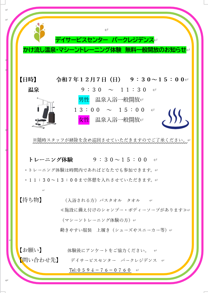 デイサービス☆温泉無料開放&マシーン体験のお知らせ☆